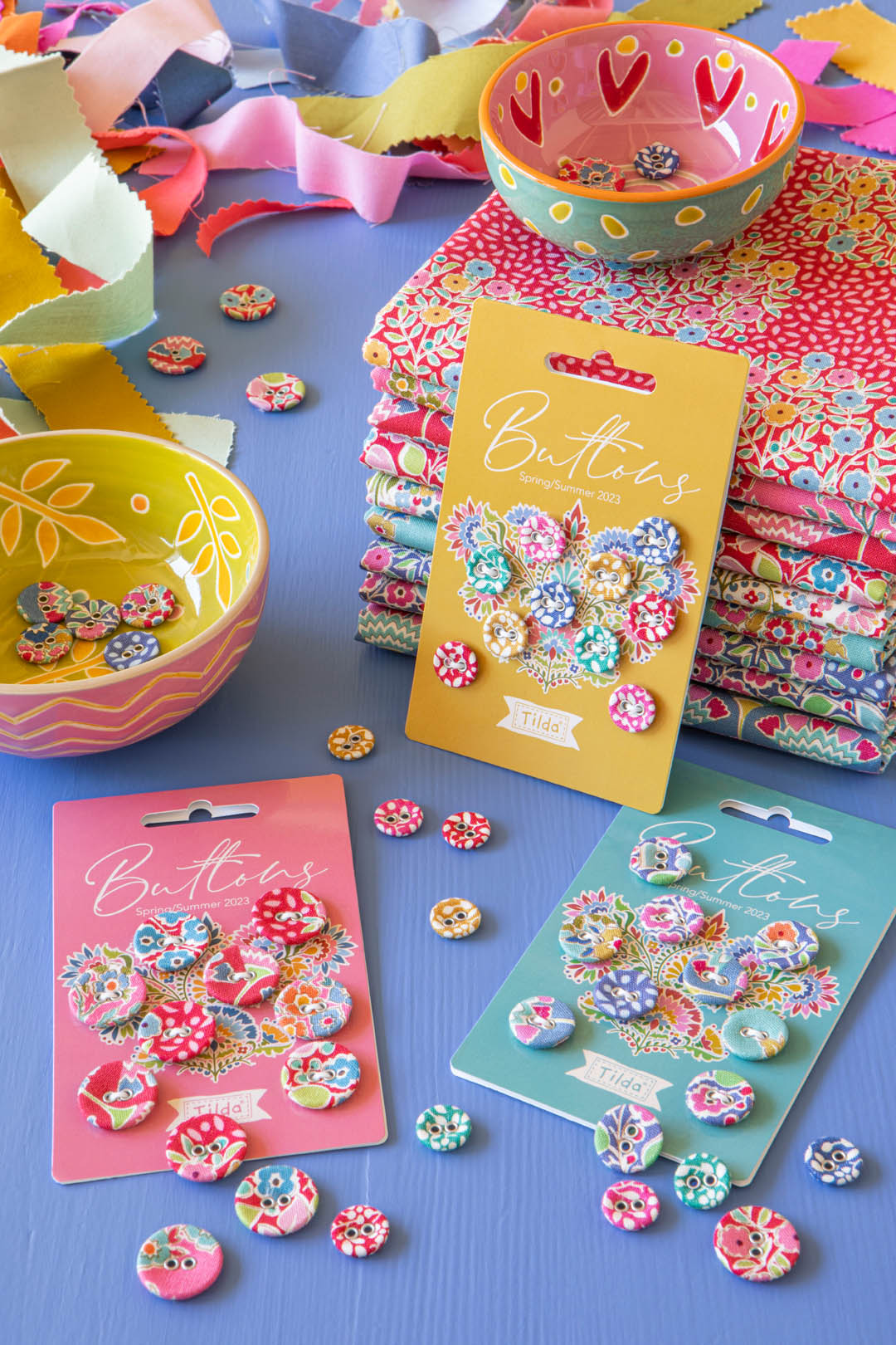 TILDA Knöpfe CLOUDPIE passend zu der Kollektion PIE IN THE SKY von 2023. Die mit Stoff bezogenen Knöpfe haben einen Durchmesser von 12 mm. Das Set enthält die 10 abgebildeten Knöpfe.